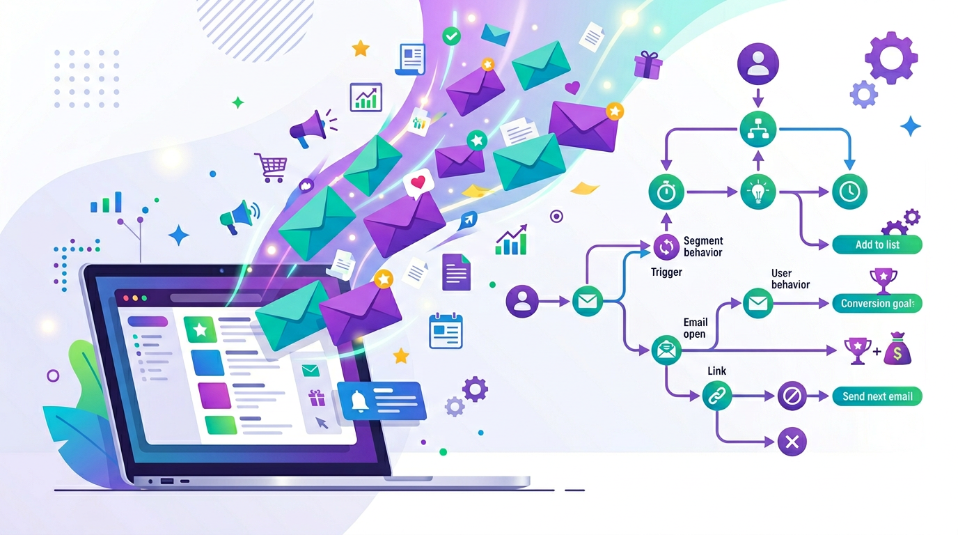 Email automation is where the real magic happens. Instead of manually sending every email, you set up sequences that trigger automatically based on subscriber behavior. Set it up once, and it runs 24/7.